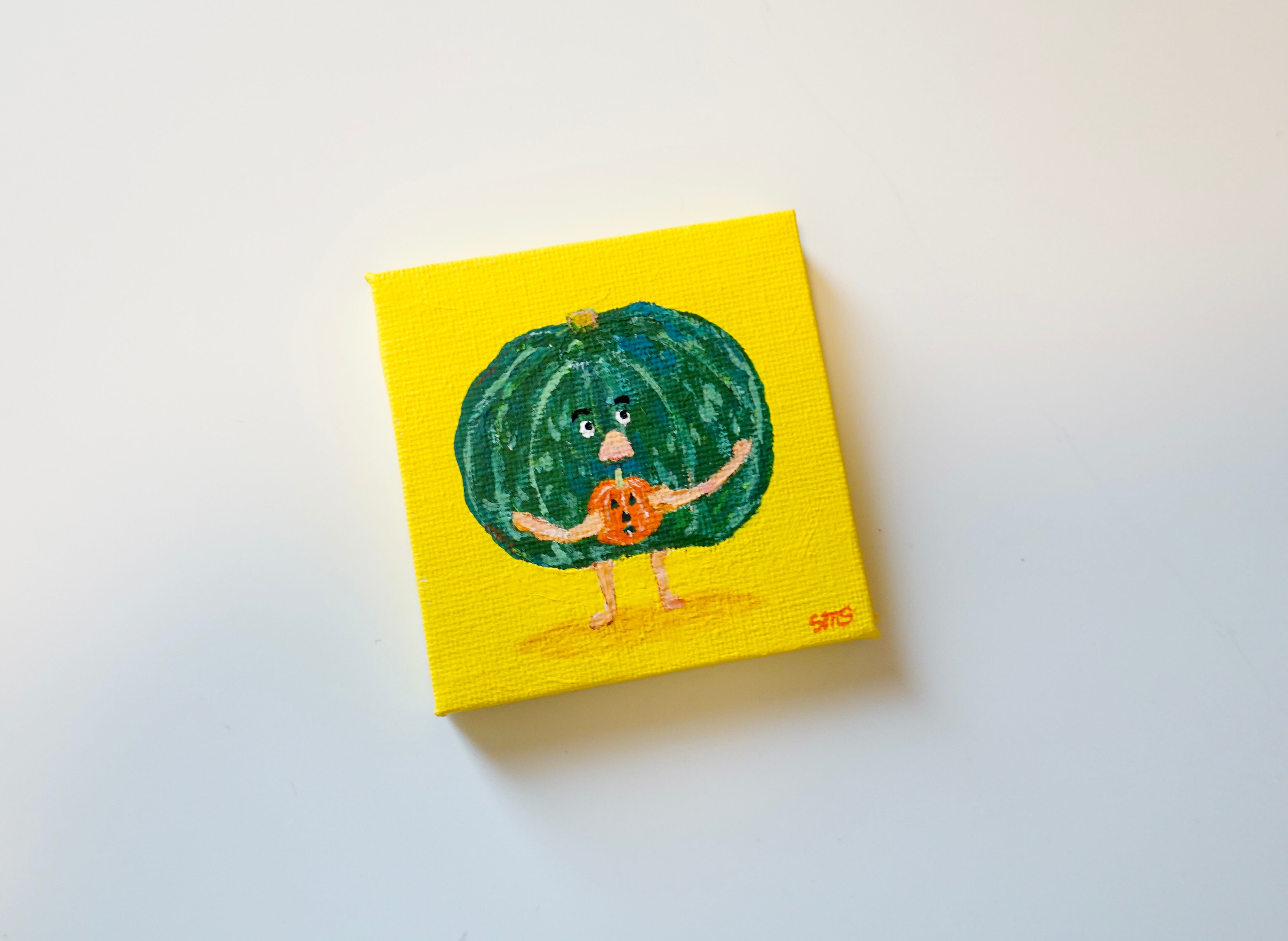 原画です。小カボチャを持つカボチャさん。 画材:アクリル絵具 サイズ:7cm×7cm ※日に当たりやすい場所だと変色する可能性があります。